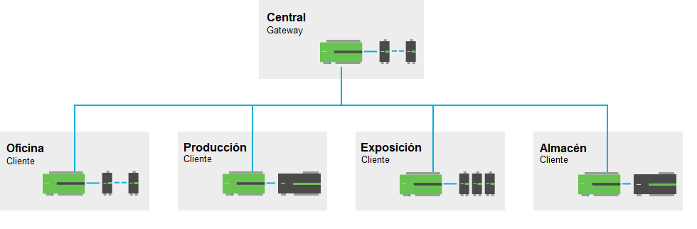 El Miniserver-Gateway és el que fa d’enllaç i recull la visualització global. Cada Miniserver és autònom i controla la seva àrea d’instal·lació, de manera que obtenim un control totalment descentralitzat. En cas de que es faci el manteniment d’una de les àrees, no afecta al conjunt i la resta continuen executant-se de forma normal. Utilitzant l’estructura Gateway/Client, el procés d’actualització es gestiona de forma central.