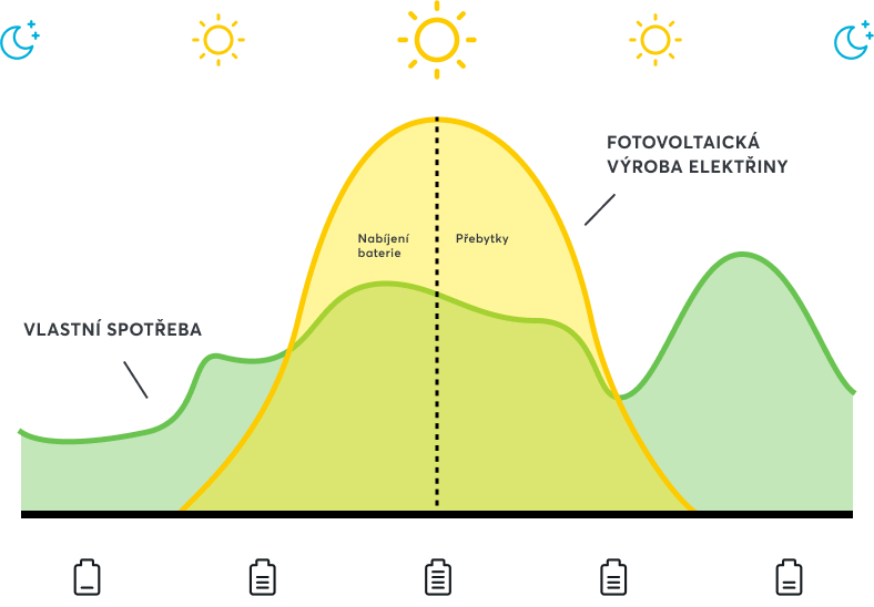 Solární baterie dávají fotovoltaice smysl po celý den. Energie z panelů vzniká hlavně kolem poledne, ale nejvíce ji potřebujeme ráno a večer. Bez úložiště přebytečná elektřina odtéká do sítě za nízkou výkupní cenu. S bateriovým úložištěm ji však můžete uložit a využít později – doma i ve firmě. Jednoduše řečeno: energii ukládat, ne rozdávat.
