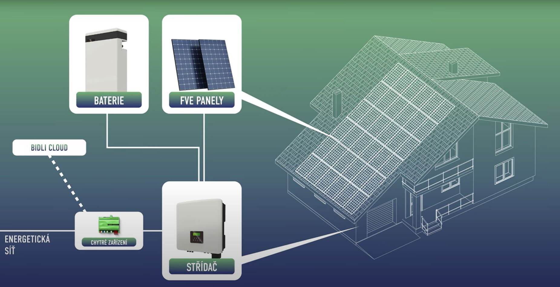 Základem systému je střídač, ke kterému jsou připojeny solární panely a bateriové úložiště. Na střídač je dále připojeno chytré zařízení – Chytrý spot – které je propojeno s cloudem Bidli Energie. Cloud nepřetržitě propočítává co nejvýhodnější nákup energií, nabíjení baterií a ohřev teplé vody. Střídač pak nakupuje elektřinu ve čtvrthodinách, kdy je spotová cena nejnižší, a zároveň optimalizuje nákup energie tak, aby se předešlo nadměrným přebytkům.