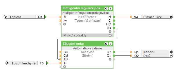 Tlačítko Loxone Touch je připojeno k bloku automatické žaluzie pomocí vstupu T5, slouží pro manuální ovládání (viz obrázek). Automatické stínění je aktivováno prostřednictvím vstupu AS. Za tímto účelem se používá stínící výstup (Qs) bloku inteligentní regulace pokojové teploty (chytrý termostat), ten aktivujte stínění, pokud se místnost přehřívá. Na výstupy Q se potom připojují relátka a aktory pro jízdu stínění nahoru a dolů.