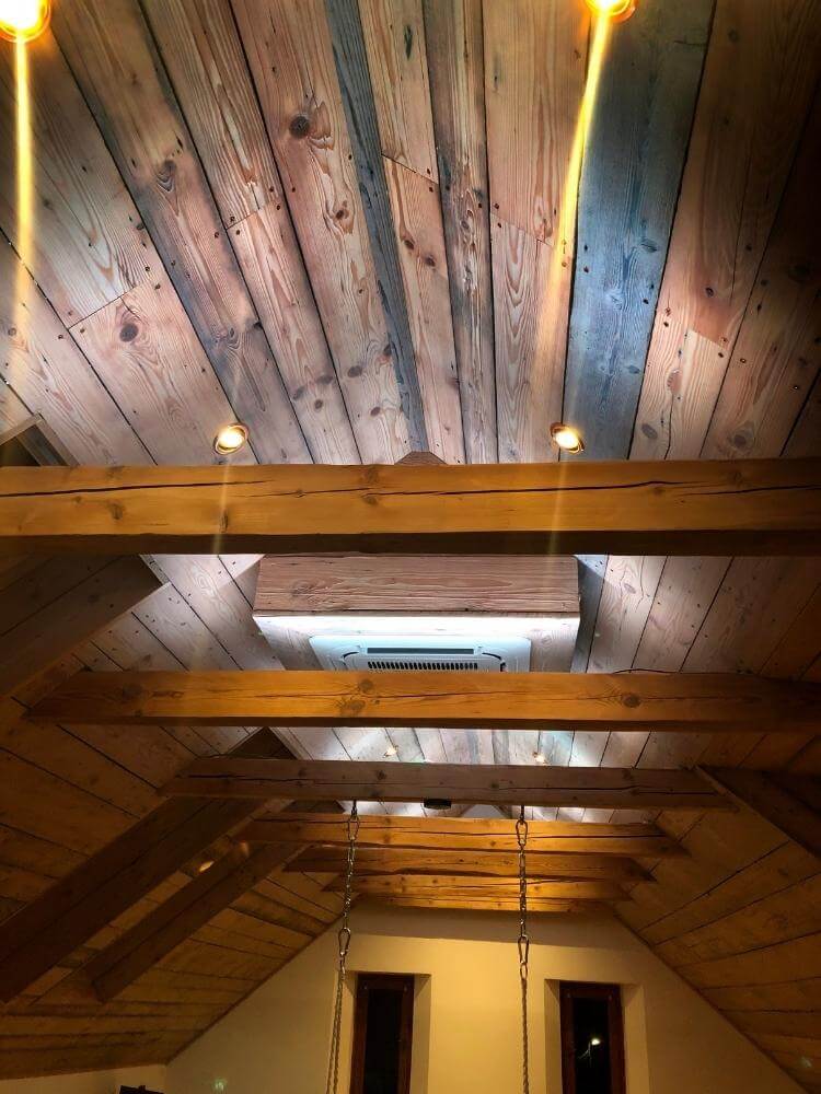 V hlavní obytné místnosti dominují na první pohled dřevěné trámy. Ráz prostoru skvěle dotváří stmívatelná i barevná svítidla – bodovky a LED pásky zapracované do dřeva ovládá Loxone. Během okamžiku tak místnost získá atmosféru na míru. To platí i pro koupelnu nebo ložnici, kde je barevně podsvícená postel.