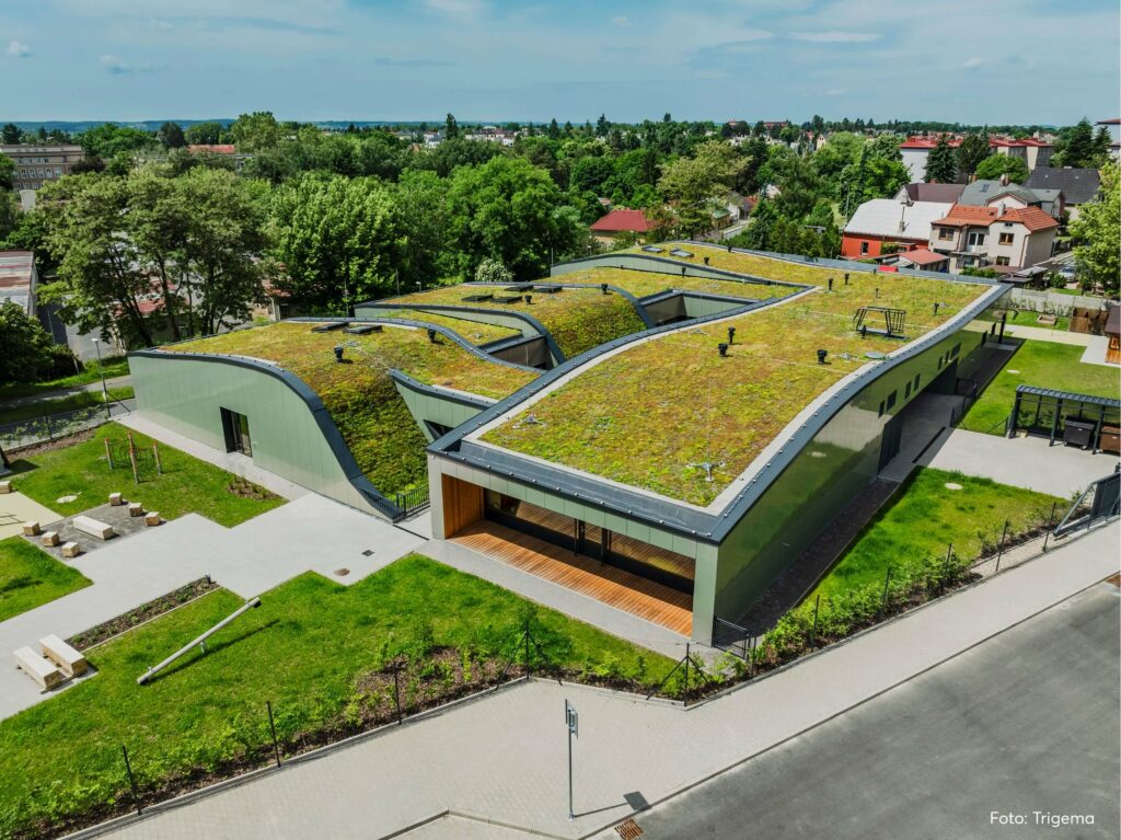 Společnost Trigema Building vybudovala výraznou stavbu ze železobetonového monolitu se zelenou zvlněnou střechou a hravou fasádou, která ale přirozeně zapadá do okolní krajiny.
