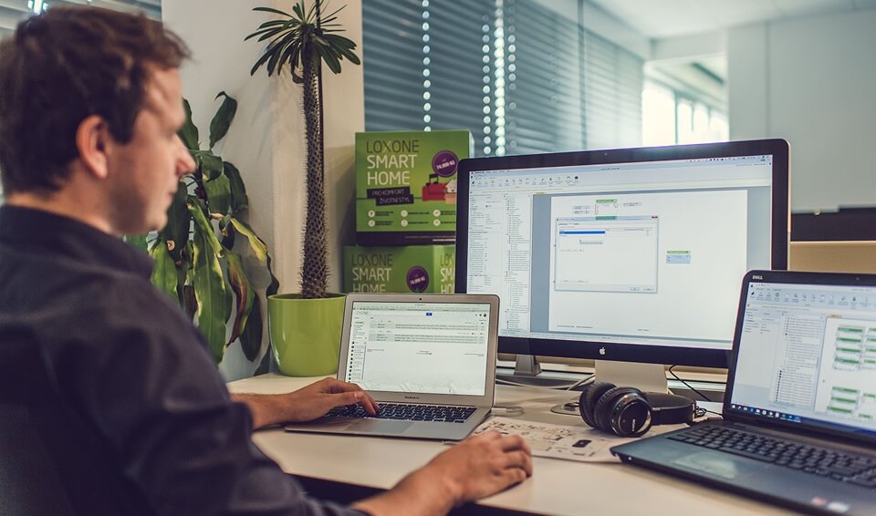 Pavel Lískovec pracuje v programovacím  nástroji Loxone Config.