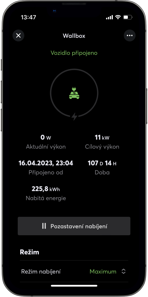 Bez nutnosti veřejné IP adresy a bez cloudu. Mobilní aplikace zobrazuje vaši spotřebu, kolik energie z FVE bylo využito i jak dlouho trvá cyklus nabíjení. V případě potřeby manuálně ovládáte režimy nabíjení.