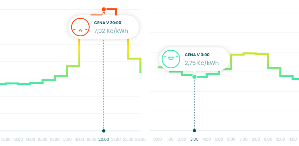 Pokud využíváte dynamických tarifů a 23. srpna 2023 byste nabíjení elektromobilu spustili ve 20:00, stálo by vás to 7,02 korun/kWh. Loxone Wallboxem by s nabíjením sám počkal až na 24. srpna a ve 3:00 by auto nabil za 2,75 korun/kWh. (Zdroj dat: nanogreen.cz)