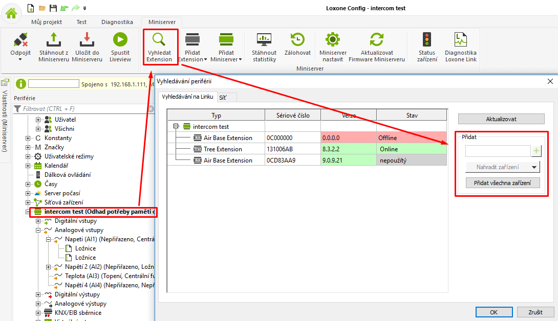 Chcete-li vložit jeden nebo více Extensionů, klikněte v Loxone Config na záložku „Periférie Miniserver“ a klepněte na tlačítko „Vyhledávání periférií“.