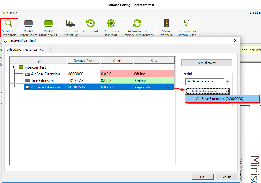 Zapojte nové zařízení a spusťte „Vyhledávání periférií“. Staré zařízení bude ve stavu „Offline“. Nové ve stavu „Nepoužitý“. Kliknutím vyberte dosud nepoužitý extension a v rozbalovacím menu „Nahradit zařízení“ vyberte to, které chcete nahradit. Nakonec klikněte na „OK“. Extension je nyní nahrazen.