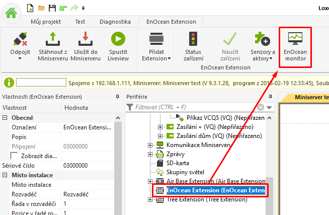 Po vyplnění sériového čísla klikněte na záložku Miniserver a nahrajte program do Miniserveru. Po restartu (trvá cca 7 sekund) by EnOcean Extension mělo blikat zeleně.