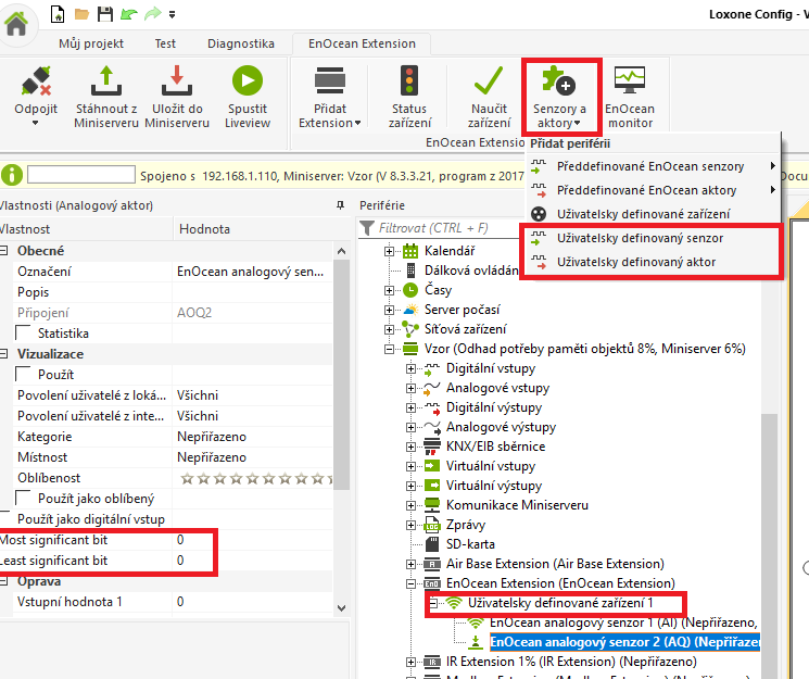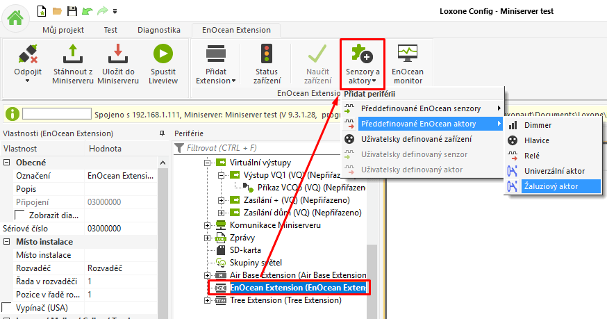 Přepněte se do záložky „Miniserver“ klikněte na položku senzory a aktory a přidejte EnOcean aktor.