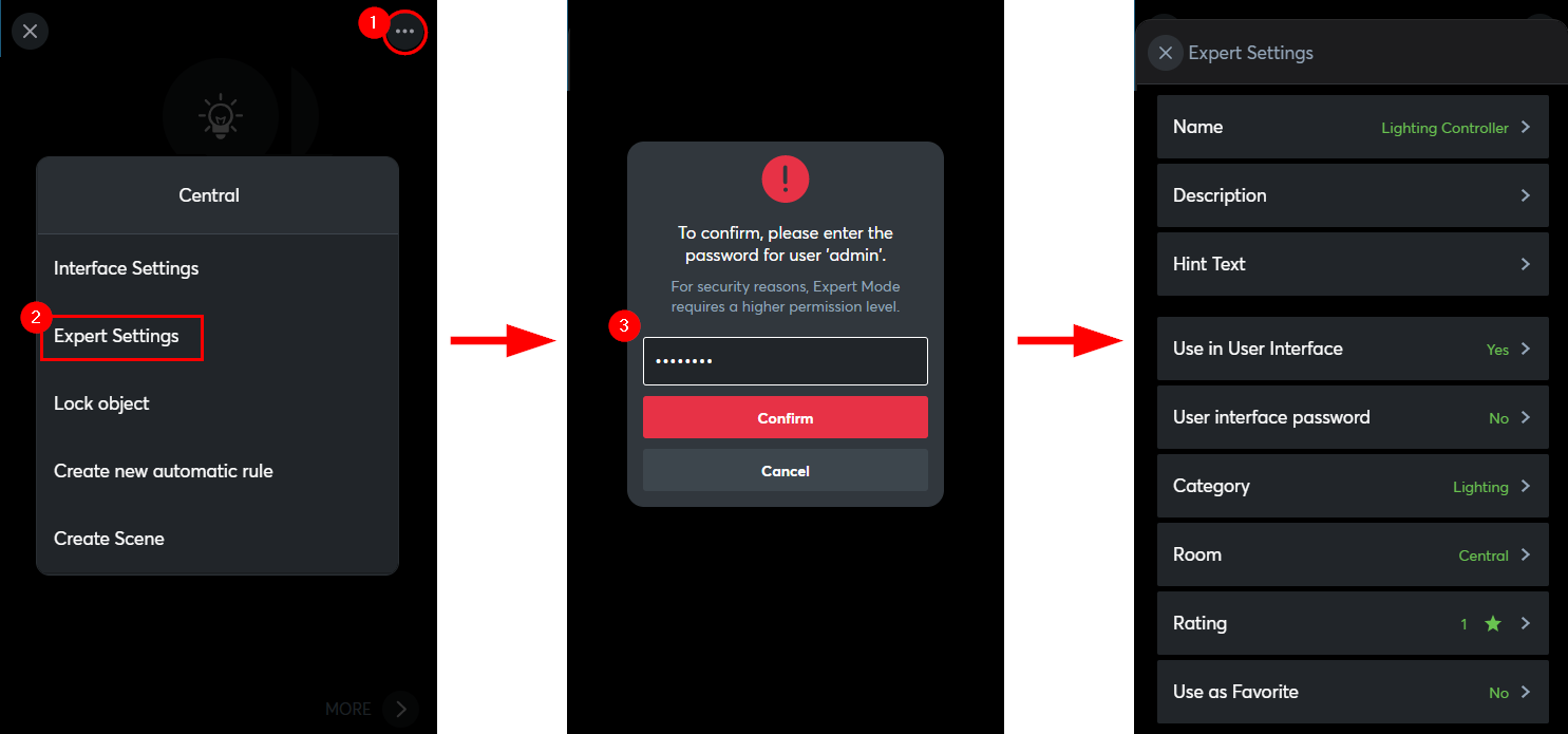 Pokud byla vybrána kategorie, místnost nebo funkční blok, můžete přepnout na příslušné Expertní nastavení.