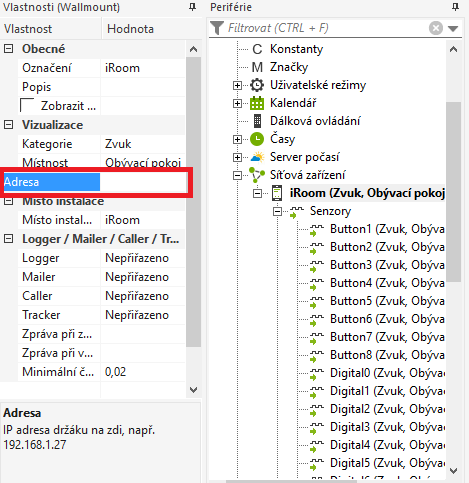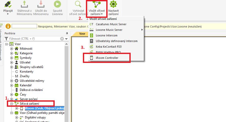 Abyste mohli využívat vstupy a výstupy z iRoom Controlleru, je nutné jej nejprve správně do programu vložit.