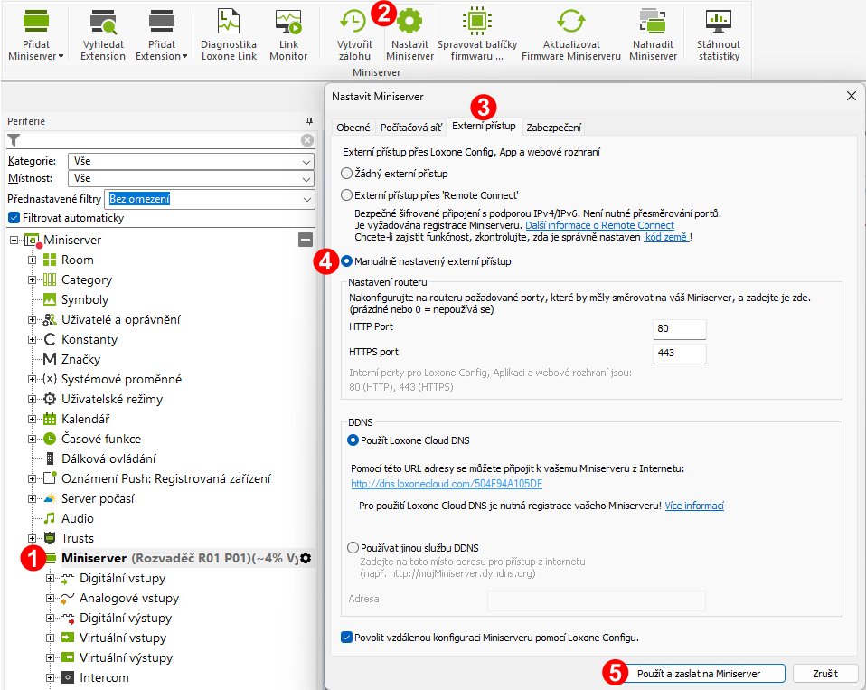 Poté otevřete Nastavit Miniserver a aktivujte možnost Manuálně nastavený externí přístup: