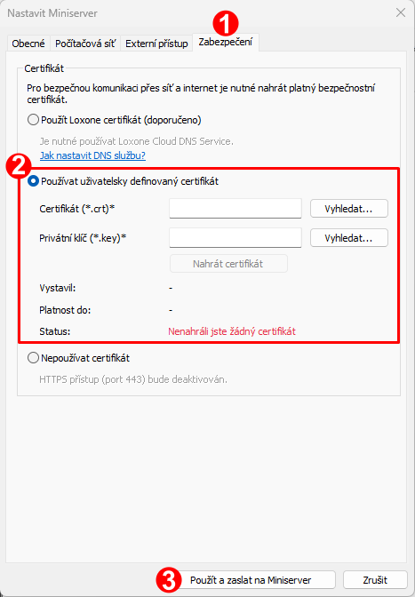 Na kartě „Zabezpečení“ vyberte možnost „Použít vlastní certifikát“ a nahrajte certifikát (.crt) a soukromý klíč (.key) zvlášť.