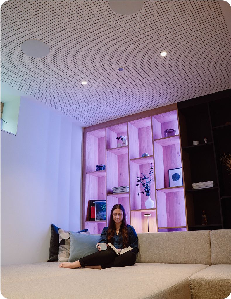 Audio se v inteligentní budově řídí v případě potřeby automaticky na základě přítomnosti – bez potřeby cokoliv ovládat.