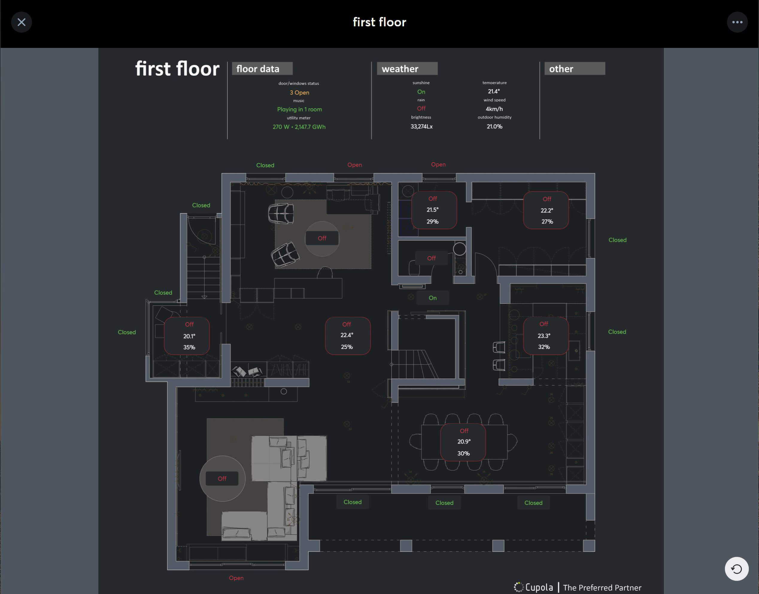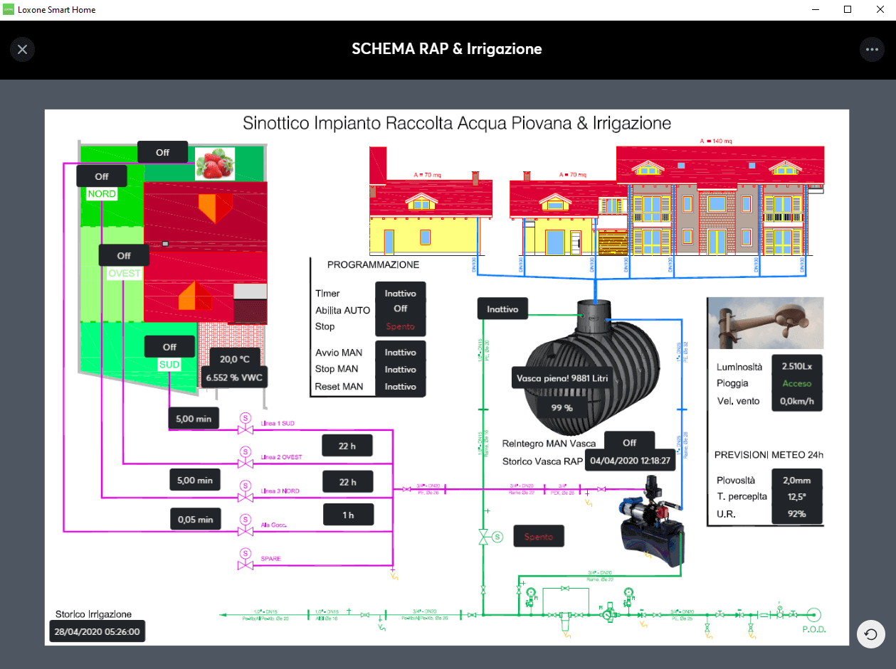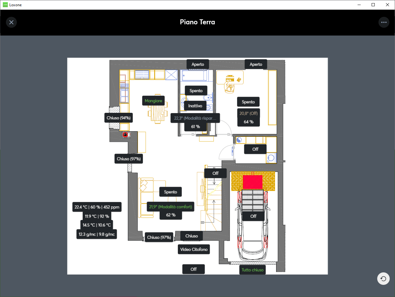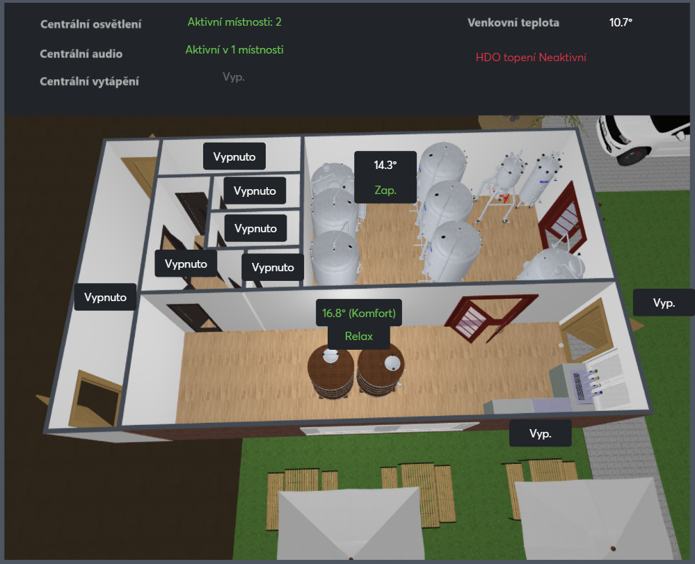 Nový funkční blok Schéma systému umožňuje aktivní vizualizaci hodnot a stavů v rámci libovolných grafických schémat a půdorysů přímo v aplikaci Loxone. K tomuto účelu lze pomocí Loxone Config ukládat libovolné obrázky a umísťovat na ně objekty a funkce z programování. Neexistují žádná omezení vaší představivosti.