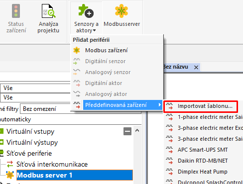 Pod vytvořeným Modbus serverem vytvořte nové zařízení importováním přiložené šablony (MB_REGO 5200.xml)