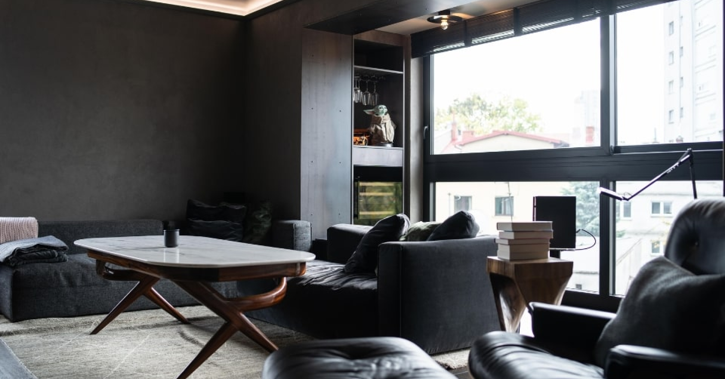 Eine Wohnung mit einem solchen Charakter braucht die perfekte Beleuchtung, um ihren geheimnisvollen industriellen Charakter zu unterstreichen. Mit dimmbarer LED-Beleuchtung wurden Lichtstimmungen für verschiedene Anlässe geschaffen. So wurde beispielsweise eine Kinoszene kreiert, bei der stimmungsvolles, gedimmtes Licht eingeschaltet wird, die Jalousien heruntergelassen werden und gleichzeitig der Projektor und die Audioanlage aktiviert werden.