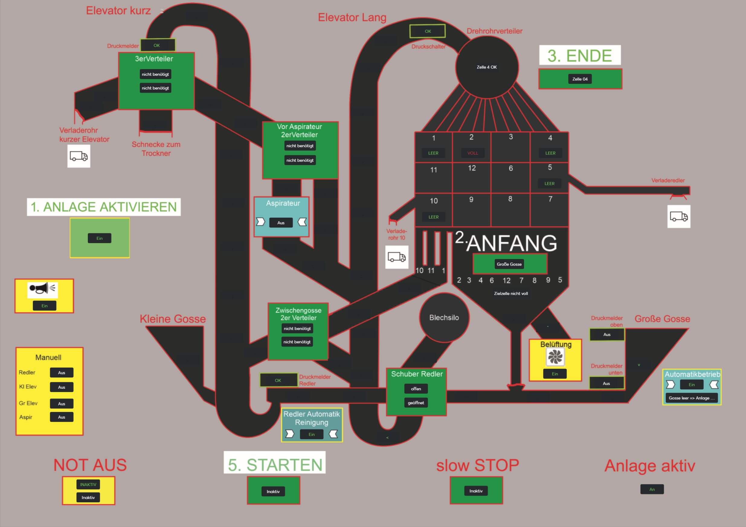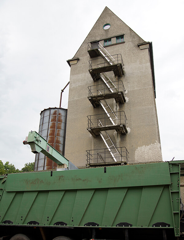 Die Bedienung dieser alten Siloanlage war stets mit viel Aufwand verbunden. Das Material musste zuerst eingefüllt und dann über ein komplexes System von Verteilern, Elevatoren und einem Drehrohrverteiler in die richtige Zelle transportiert werden. Aufwand, der sich mit Loxone vermeiden lässt.