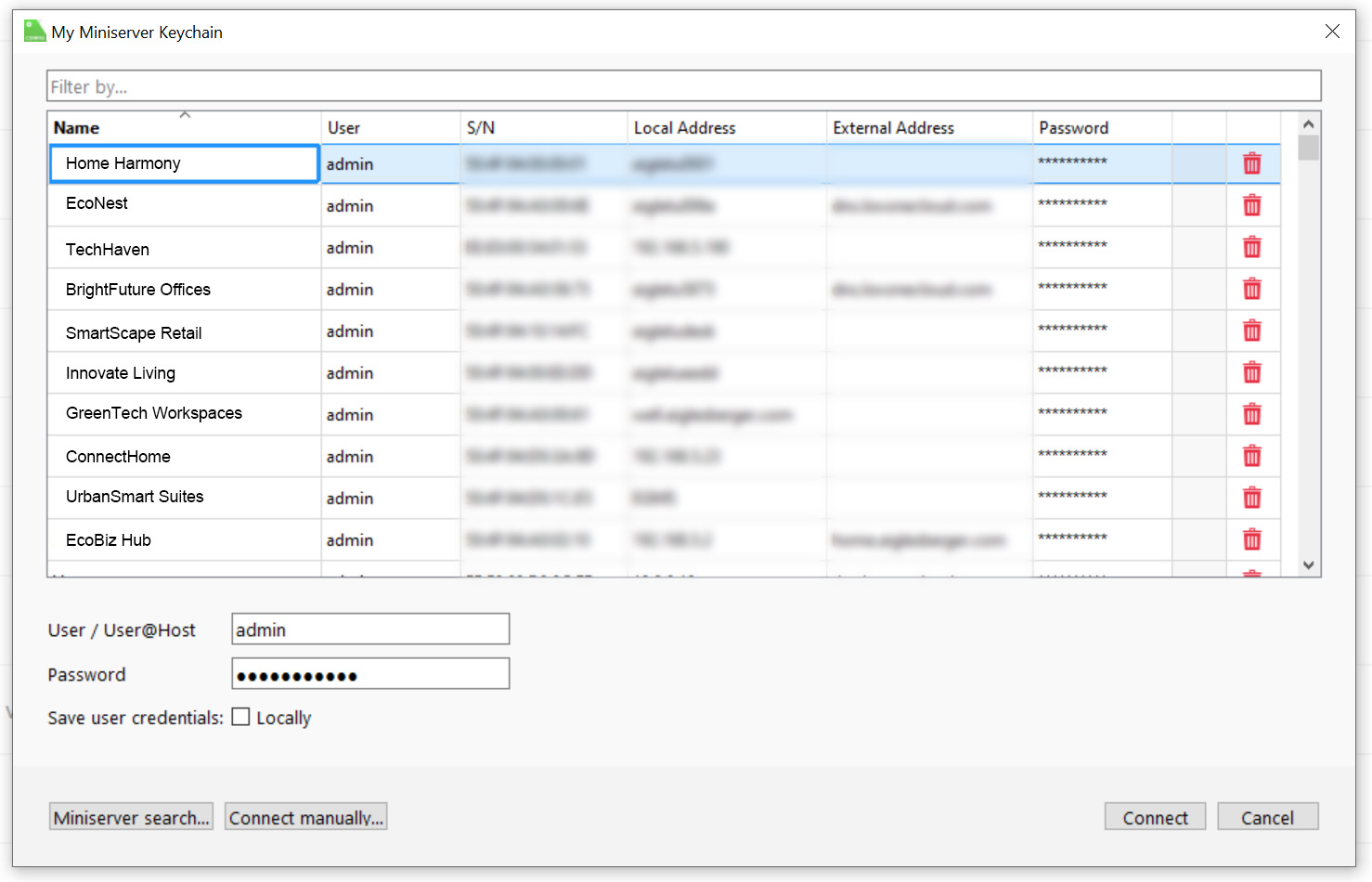 Mit der neuen Miniserver Keychain kann man auf dem Startbildschirm der Config schnell zwischen allen Miniservern auswählen, mit denen man sich in der Vergangenheit verbunden hat und deren Zugangsdaten gespeichert sind. Zusätzlich wird auch der Name des Miniservers angezeigt.
