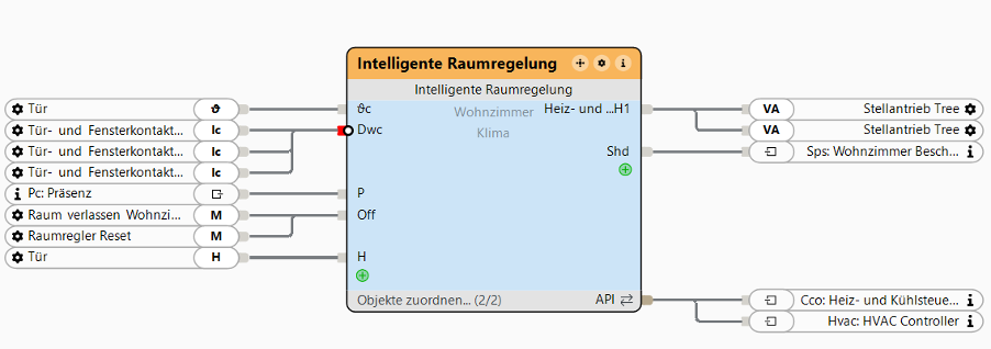 Im Hintergrund sorgt der Config-Baustein „Intelligente Raumregelung“ für die bedarfsgerechte Steuerung. Er analysiert laufend Sollwerte, Außentemperatur, Präsenz und Tageszeit und leitet daraus präzise Heiz- und Kühlanforderungen ab.