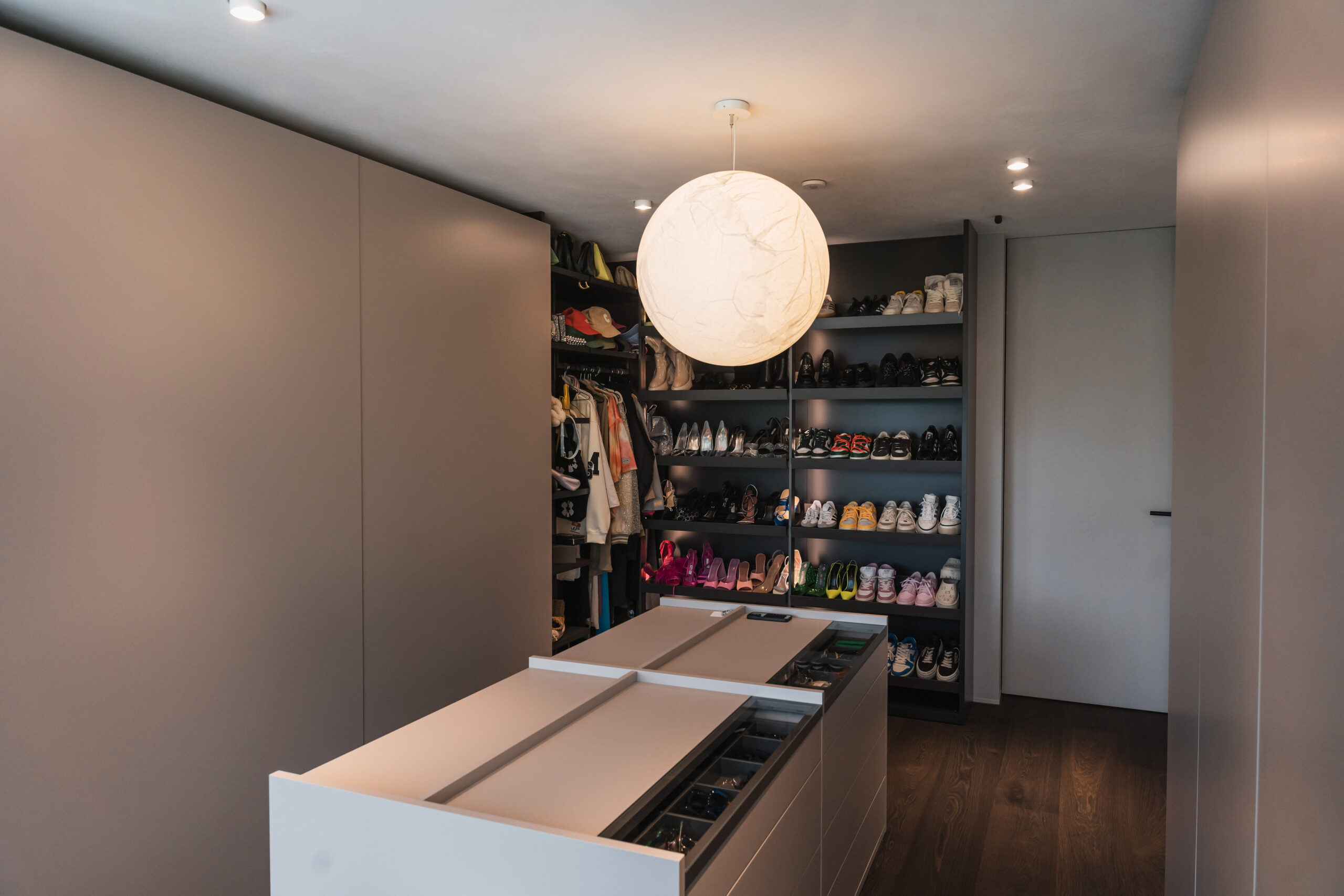 Ein echtes Highlight ist Karos Ankleidezimmer. Es bietet genügend Platz für ihre großzügige Schuhsammlung, die dank smarter Beleuchtung perfekt in Szene gesetzt wird.