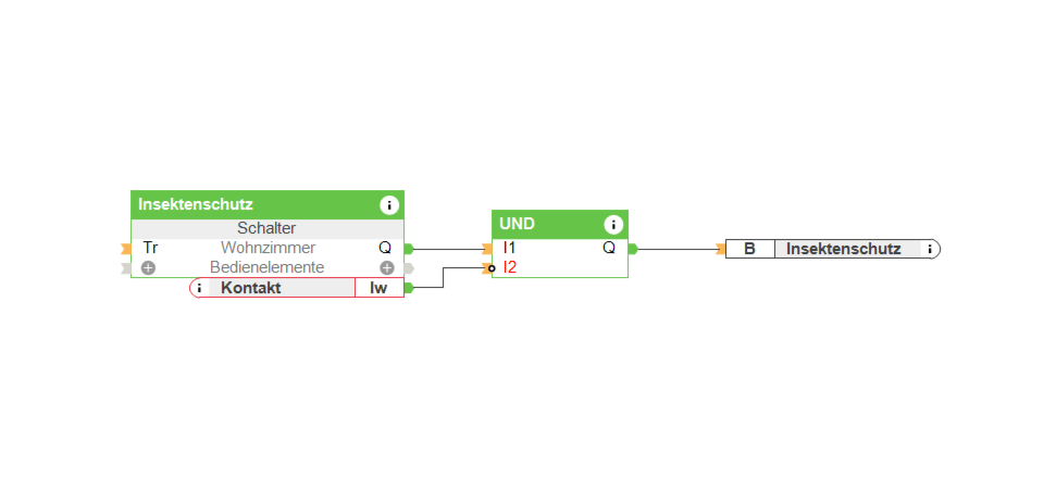 Damit bei jedem Aktivieren des Betriebsmodus “Insektenschutz” zusätzlich ein Impuls am Bewegungsmelder Eingang Mv getriggert wird, ist ein “Tastschalter”-Baustein notwendig.