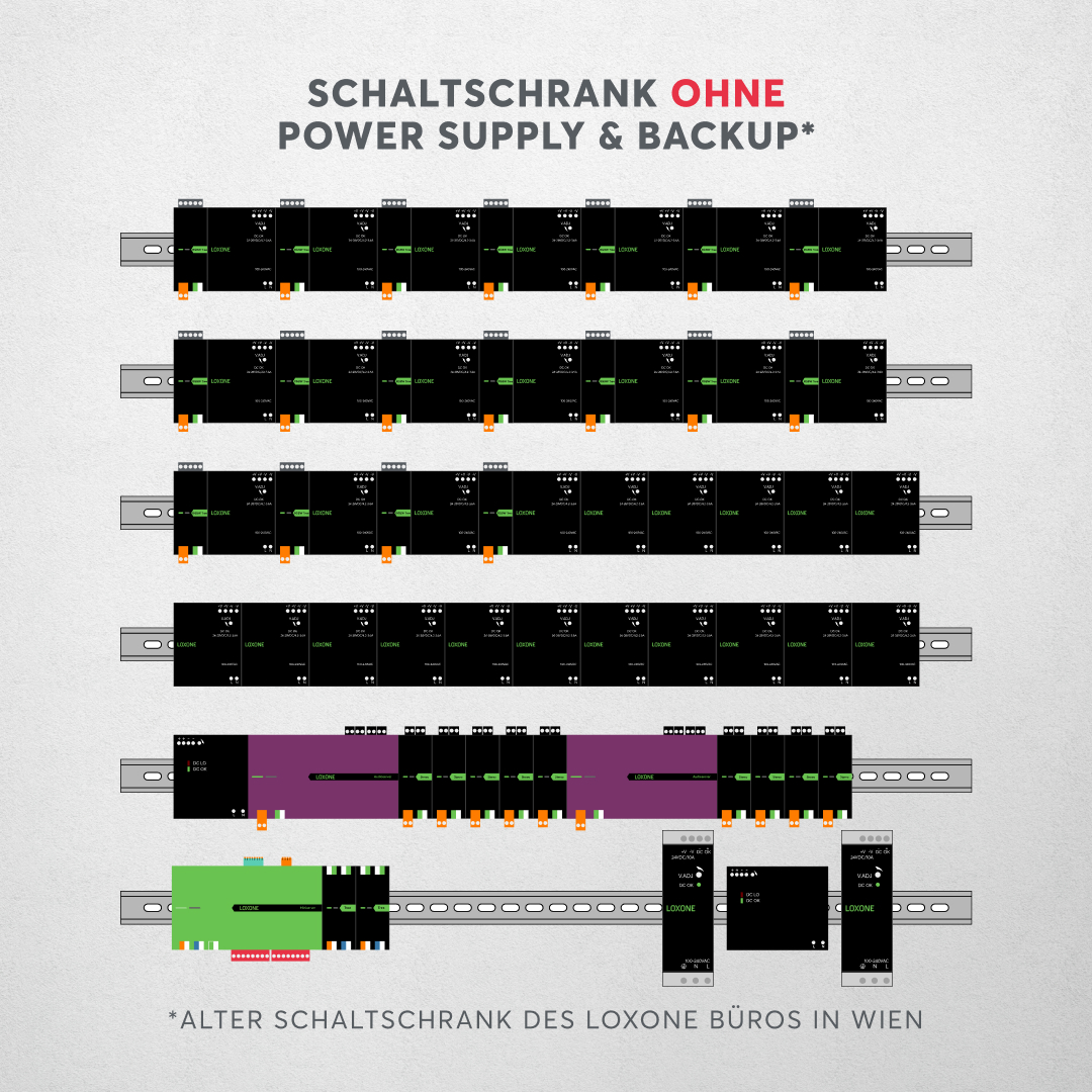 Bei den Verteilerkomponenten, wie dem Miniserver und seinen Extensions, und auch bei allen Peripherie Geräten, wie Präsenzmeldern oder Touches, wird mit 100% der benötigten Leistung gerechnet.