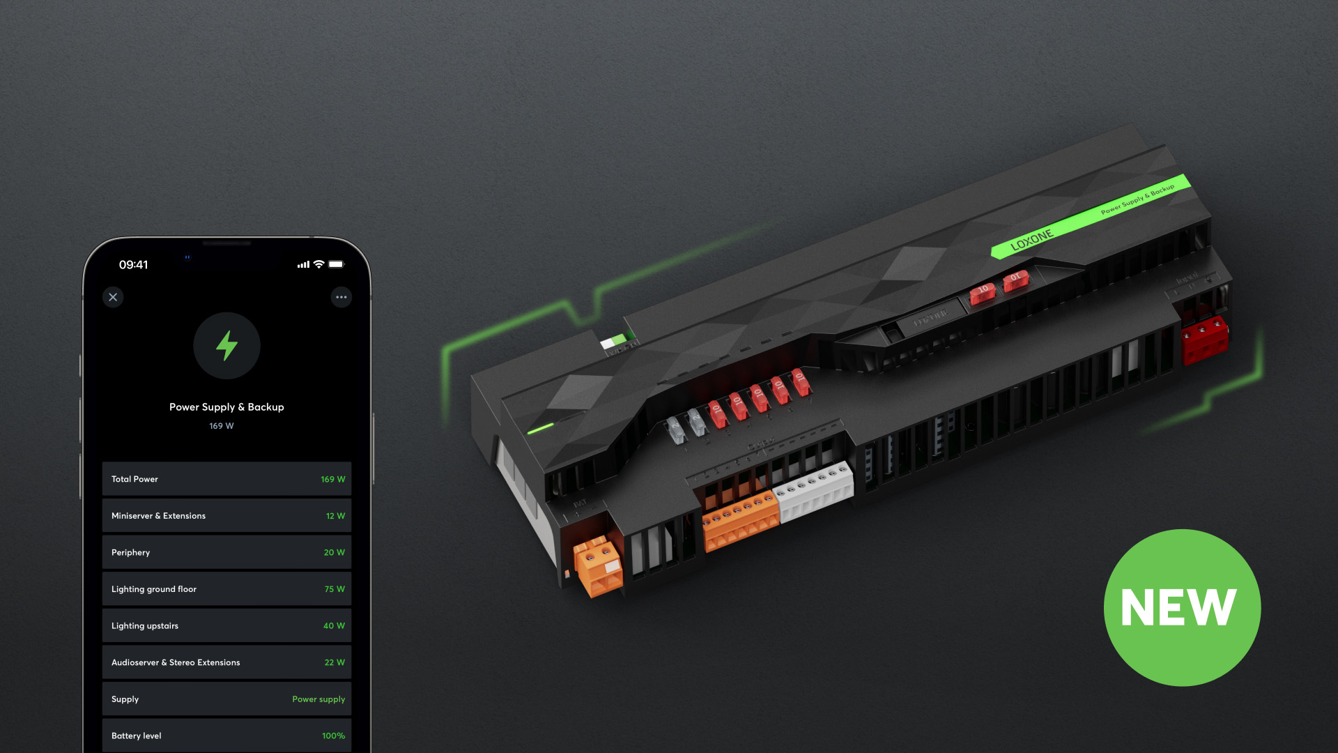 Das neue Power Supply & Backup (Art. 100401) ist ein Hutschienennetzteil das die Spannungsversorgung all Ihrer Loxone Produkte übernimmt – in Kombination mit einer externen Batterie auch im Falle eines Netzausfalls. Die sieben 24V Ausgänge liefern insgesamt bis zu 40A, verfügen über eine Leistungsmessung und sind mit austauschbaren Sicherungen ausgestattet.