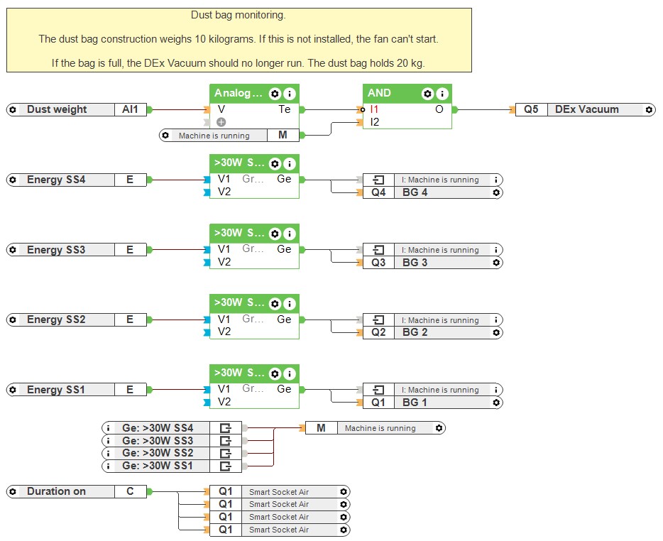 Wird nun bspw. die Bandsäge aktiviert, registriert die Smart Socket Air den erhöhten Stromverbrauch was wiederum den Staubsauger aktiviert und das entsprechende Absperrventil öffnet.