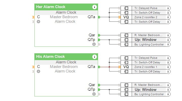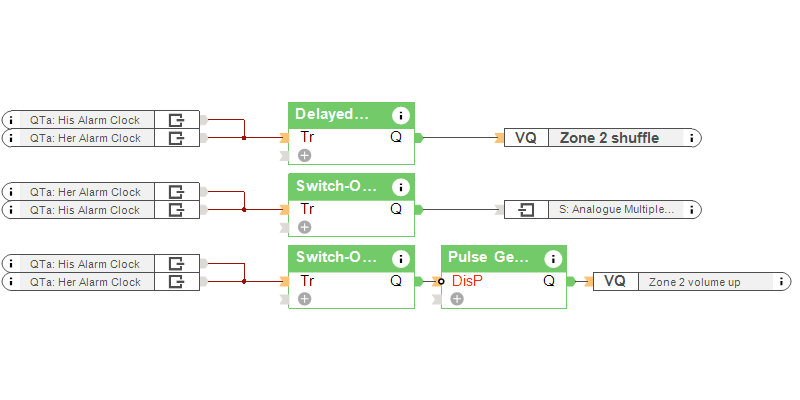Nach dem der Wecker-Baustein nun den Alarm auslöst, wird eine vorher definierte Playlist abgespielt. Gleichzeitig wird ein Zonen-Befehl für das zufällige Abspielen eines Titels der Morgen-Playlist getriggert.
