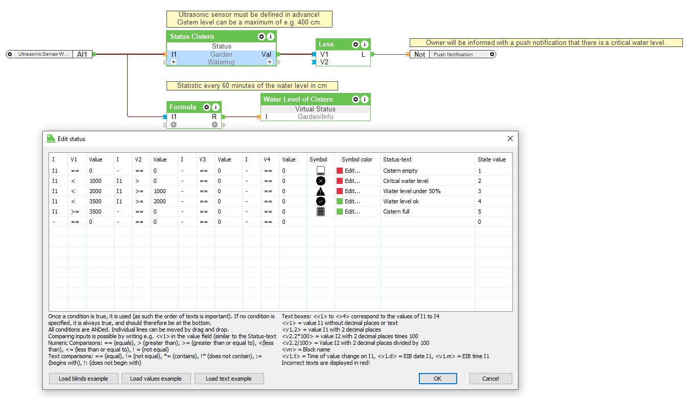 Wird ein kritischer Wasserstand erreicht (unter 50 %), wird der Besitzer via Push Notification in der Loxone App darüber in Kenntnis gesetzt. So wird ein Trockenlaufen der Wasserpumpe vermieden. Hierzu wurden im Vorfeld mit Hilfe des Status-Bausteins unterschiedliche Statuswerte gesetzt: