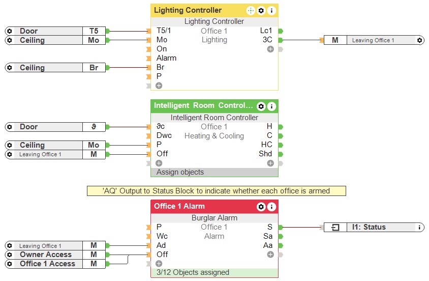 In diesem Anwendungsbeispiel befinden sich drei unterschiedliche Büros in einem Gebäude. Loxone wird in den Büros für die Sicherheit, die Beleuchtung und die Heizung eingesetzt. Jede Mietgruppe verfügt über eine eigene Alarmanlage. Mit einem Dreifachklick auf einen Taster neben der Eingangstür wird diese im jeweiligen Büro aktiviert. Gleichzeitig wird die Beleuchtung ausgeschaltet und die Heizung fährt in den Ruhemodus. Die Info, dass sich niemand mehr im Büro aufhält, wird automatisch an die Alarmanlage im Allgemeinbereich übergeben. Der Baustein „Status“ weiß automatisch, wann alle drei Büros verlassen wurden und gibt diese Info wiederum an den Baustein „Alarmanlage“ weiter. Um den Alarm für den Allgemeinbereich scharf zu stellen, wird der Abwesenheitsmodus vom Gesamtgebäude aktiviert.