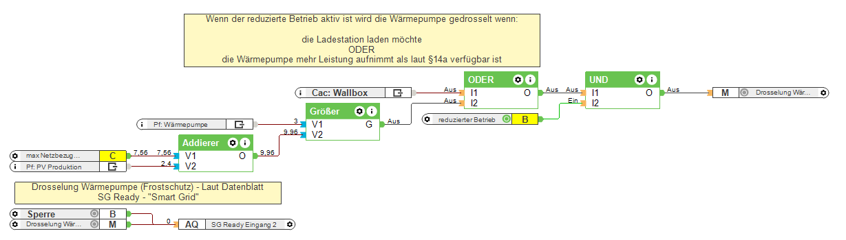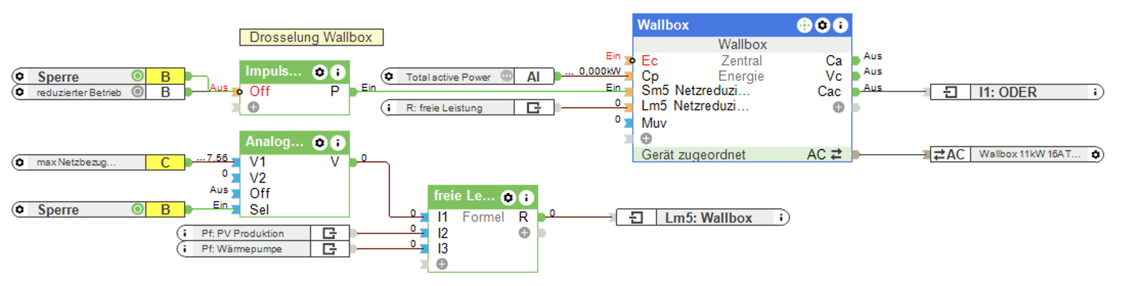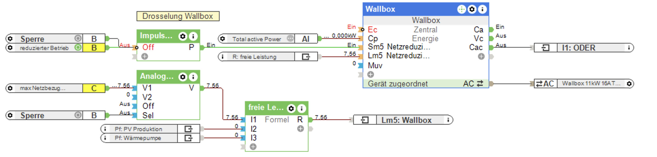 Im Falle einer Sperre des EVU wird das Laden über die Wallbox über den Analogwahlschalter auf 0 reduziert und die Wärmepumpe in den Frostschutz Betrieb versetzt. (SG Ready***)