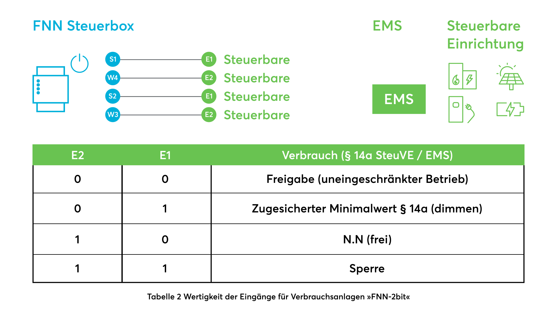 Die Signale werden mit Stand Q1 2024 über digitale relaisbasierte Ausgänge einer VDE FNN Steuerbox ausgegeben. **