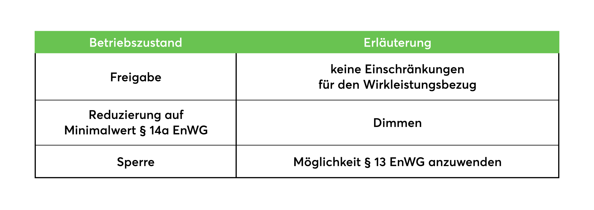 Die Bundesnetzagentur sieht vor, diese sog. „steuerbaren Verbrauchseinrichtungen (SteuVE)“ bei kritischen Netzsituationen in ihrer Leistung reduzieren („dimmen“) zu können, um allen Letztverbrauchern ein stabiles Netz zu gewähren.