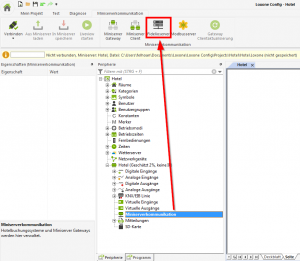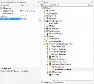 Hierfür geht man in der Config in der Peripherie auf “Miniserverkommunikation” und wählt in der Menüleiste “Fidelioserver” aus. Hier wird dann einmal ein “Fidelioserver” hinzugefügt und ein “Miniserver Gateway”.