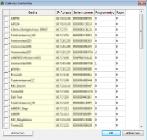 Unter Konfiguration kann man einen Dialog öffnen. In diesen kann man nach Miniservern im Netzwerk suchen und diese zu den Client Gateway hinzufügen. Hier wird auch definiert welchen Programmtyp (Zimmertyp) der Client hat. Zudem kann man hier die Zimmernummer der Clients definieren. Dies ist wichtig damit der Gateway die einzelnen Clients mit den gleichen Programmtyp unterscheiden kann.