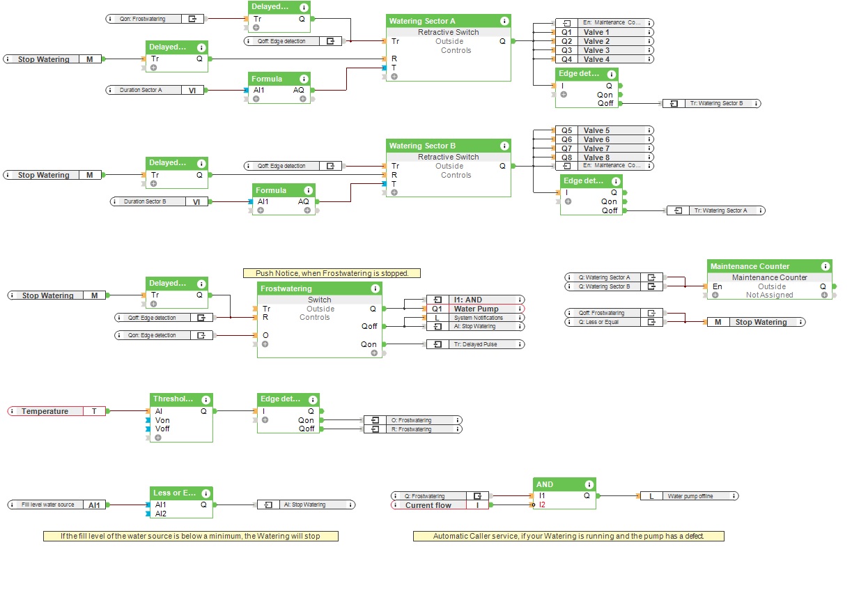 Schwellwertschalter werden eingesetzt um die Pumpe abhängig von der gemessenen Außertemperatur zu aktivieren. Mittels dem „Schalter“-Block kann die Pumpe auch manuell über die Loxone App ein- oder ausgeschaltet werden. Die Ventile an den Wasserleitungen sind mit dem „Schalter“-Block verbunden.