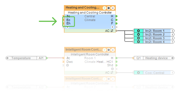 Nun fügen Sie in der Loxone Config den Funktionsbaustein „Intelligente Raumregelung“ ein. Jeder Raum benötigt einen separaten Baustein.