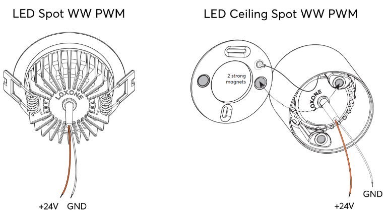 Diese Spots werden mit einer Nennspannung von 24V DC versorgt, und können mittels PWM gedimmt werden.
