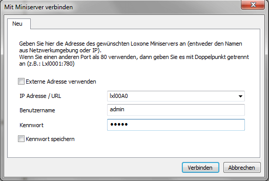 Wählen Sie in den Suchergebnissen den Miniserver per Doppelklick aus oder verbinden Sie sich unter dem Register „Miniserver“ per Klick auf „Verbinden“ mit Ihrem Miniserver. Den Namen des Miniservers bzw. die IP entnehmen Sie den Suchergebnissen bzw. ist bereits eingetragen. Der Username und das Passwort lauten „admin“.