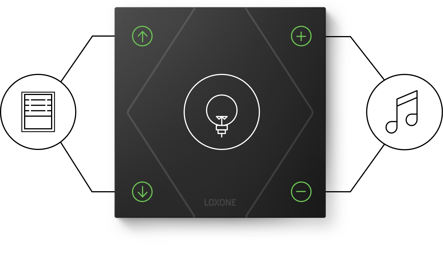 EinfachklickEine Berührung auf den großen Taster in die Mitte schaltet die Beleuchtung ein oder ändert die Lichtstimmung. Mit einem Klick auf die Taste links oben fährt die Beschattung auf, links unten fährt sie hinunter. Rechts wird die Musik gesteuert. Ein Klick auf die Taste oben und es wird lauter, ein Klick unten und es wird leiser. |