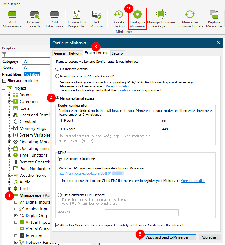 Anschließend öffnen Sie Miniserver konfigurieren, und aktivieren Externer Zugriff manuell: