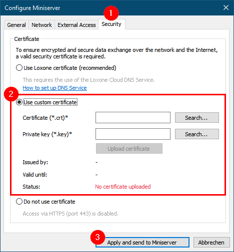 Wählen Sie “Benutzerdefiniertes Zertifikat verwenden” im Register “Sicherheit” aus und laden Sie das Zertifikat (.crt) und den privaten Schlüssel (.key) separat hoch.
