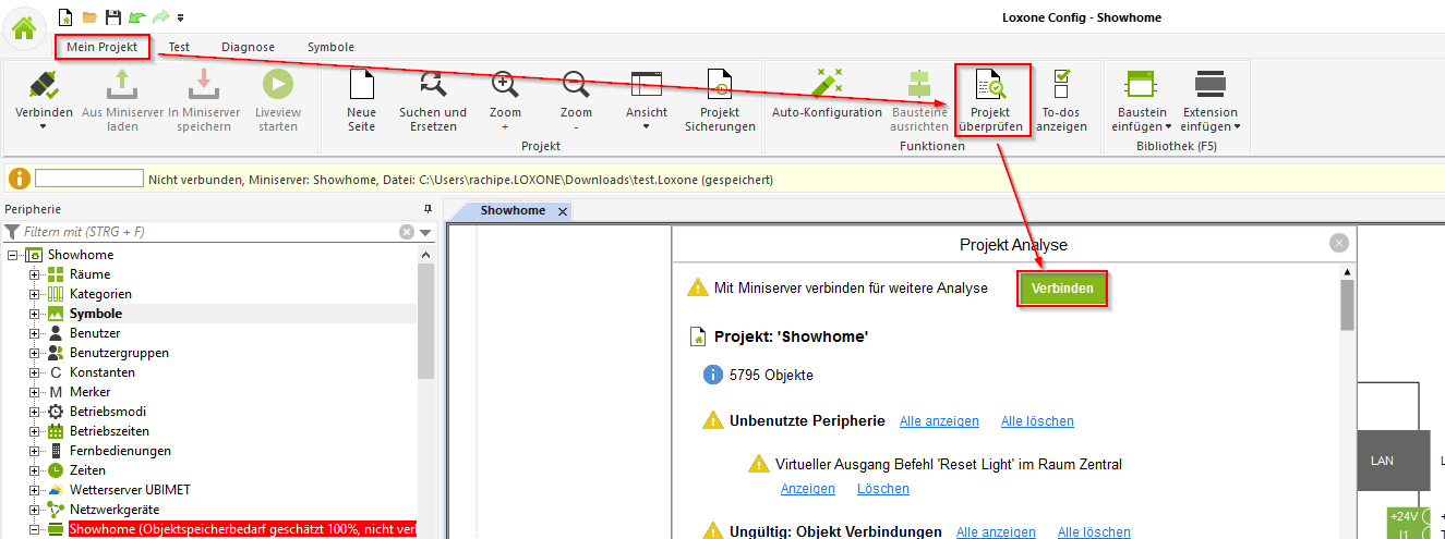 Die Projektanalyse Funktion ist im Menü unter „Mein Projekt“ -> „Projekt überprüfen“ zu finden.