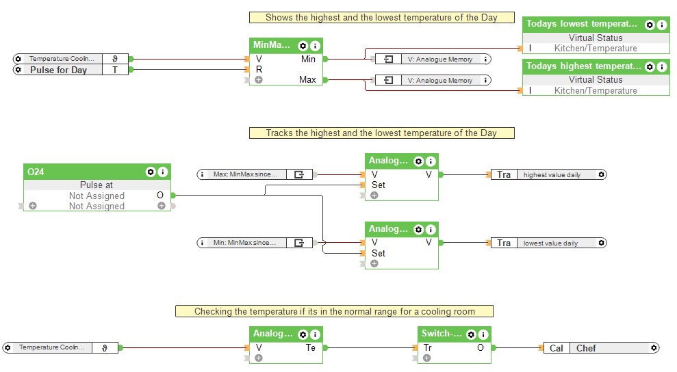 Gerade im gewerblichen Bereich kann es erforderlich sein, dass Temperaturunter- bzw. überschreitungen protokolliert werden müssen. Dies wurde in unserem Beispiel über den Funktionsbaustein “Min Max seit Reset” gelöst. Durch den täglichen Impuls wird somit der maximale und minimale Wert visualisiert. Parallel werden die täglichen Min. Max. Werte in einem “Tracker” in der Loxone App bereitgestellt.
