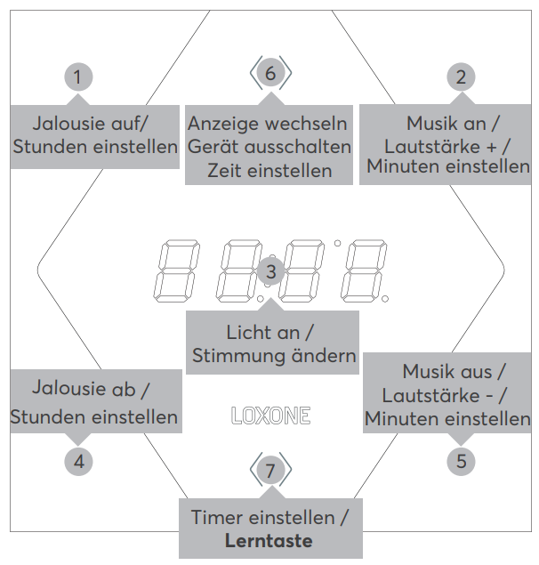 Möchten Sie den Lernmodus manuell aktivieren, so schalten Sie das Gerät zunächst mit Taste 6 aus, und wieder ein. Drücken Sie unmittelbar danach die Lerntaste (Taste 7) für min. 5 Sekunden.