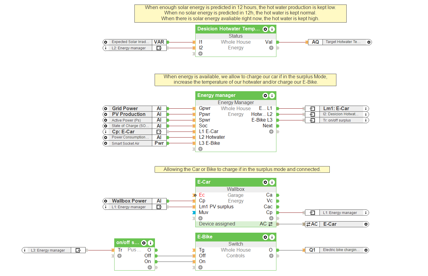 In einem modernen Gebäude gibt es eine ganze Reihe an elektrischen Verbrauchern. Beleuchtung, Heizungssysteme, Kühlgeräte, Küchengeräte, Computer, Elektroautos und Co.. Gebäude verbrauchen nicht nur Energie, sie können auch welche erzeugen. Dies geschieht meist mit Hilfe einer Photovoltaikanlage. PV-Anlagen erzeugen im Privathaushalt offt dann die meiste Energie, wenn niemand Zuhause ist. Tagsüber ist der Solarertrag am höchsten, der Stromverbrauch allerdings im Privatbereich am niedrigsten. Somit muss der Photovoltaik Überschuss intelligent gesteuert und in die richtigen Bahnen gelenkt werden. Die selbst erzeugte Energie kann beispielsweise dafür verwendet werden, um Batteriespeicher und Elektroautos zu laden oder die Kesseltemperatur zu erhöhen. Diese umgewandelte und gespeicherte Energie kann dann zu einem späteren Zeitpunkt optimal genutzt werden.