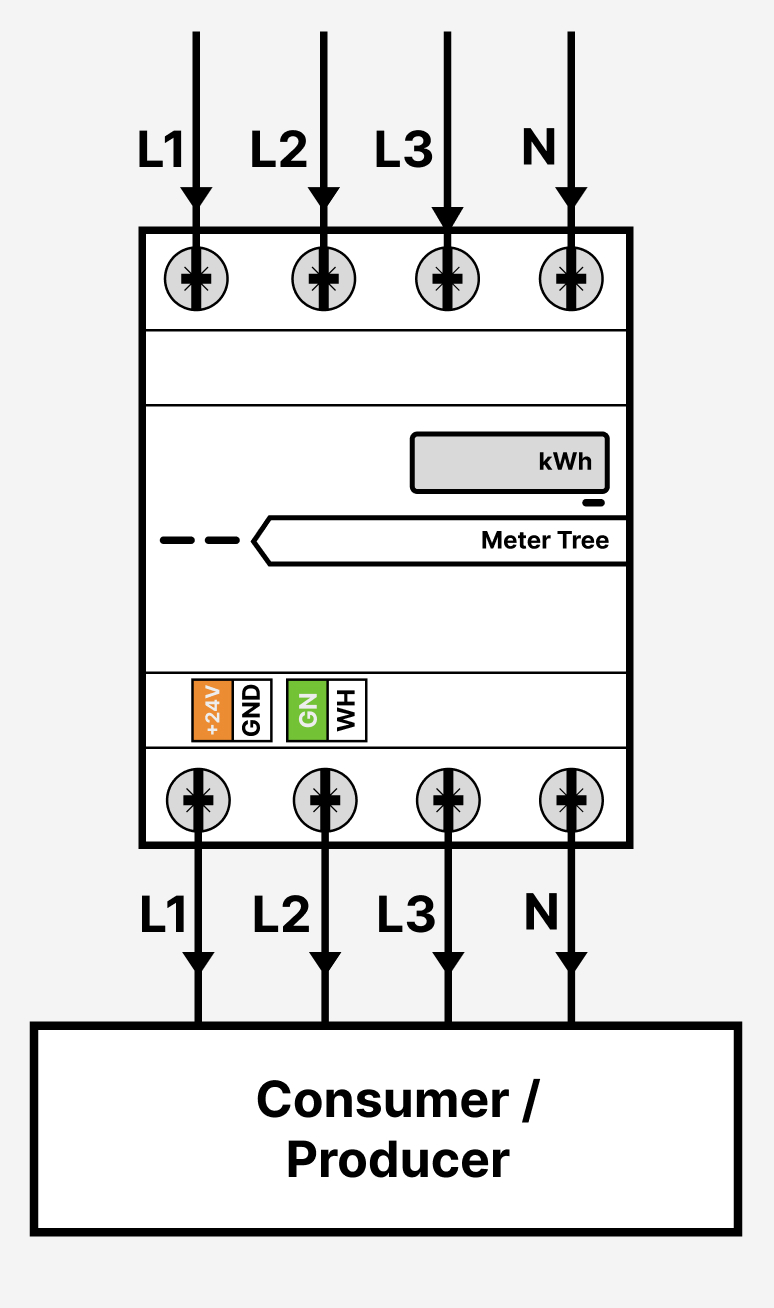Der Energiezähler 3-phasig Tree ist MID-zertifiziert und misst den Stromverbrauch über alle drei Phasen. Vor allem in größeren Installationen oder gewerblichen Anwendungen wird das benötigt.