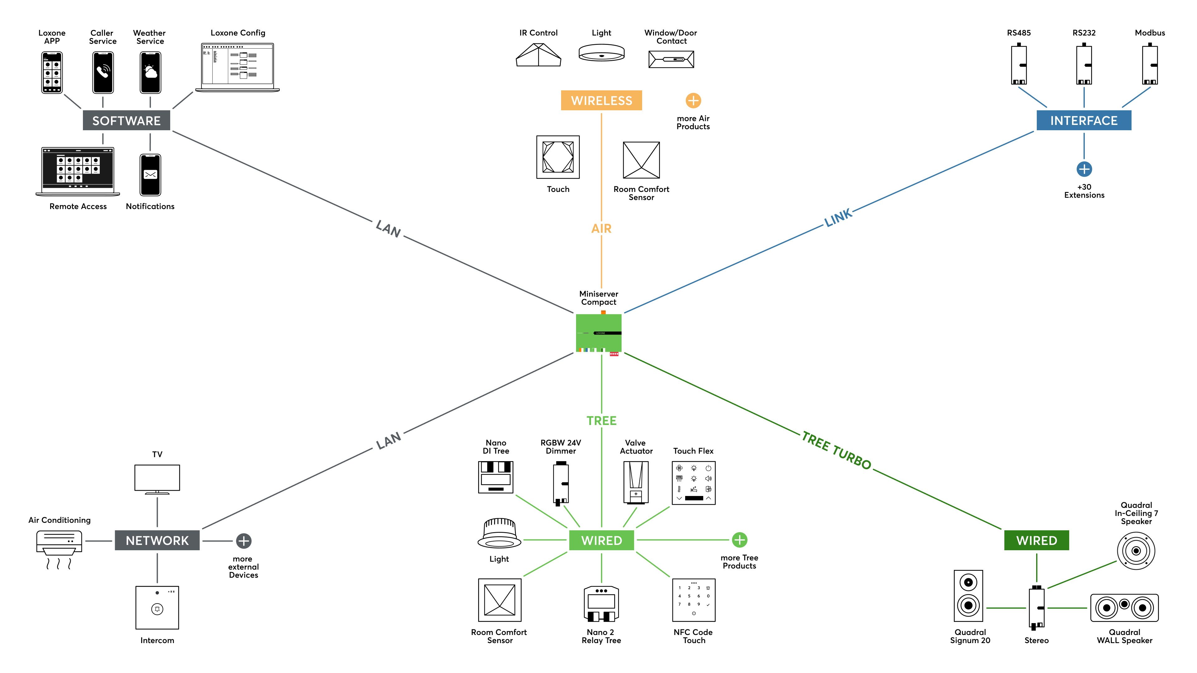 Ob LAN, leistungsstarke Relais, analoge sowie digitale Eingänge, Loxone Tree oder Link – der Miniserver verfügt onboard bereits über zahlreiche Schnittstellen, um verschiedenste Sensoren und Aktoren in Ihre Gebäude- & Hausautomation einzubinden.
